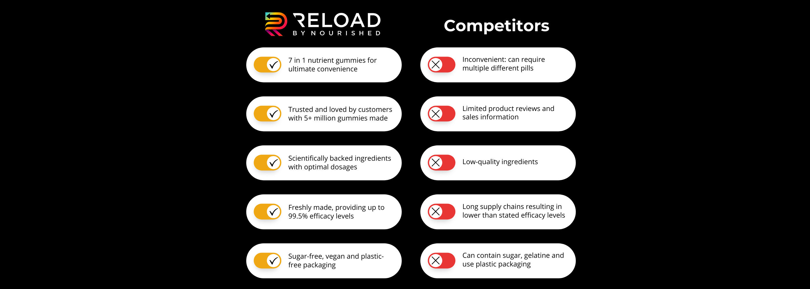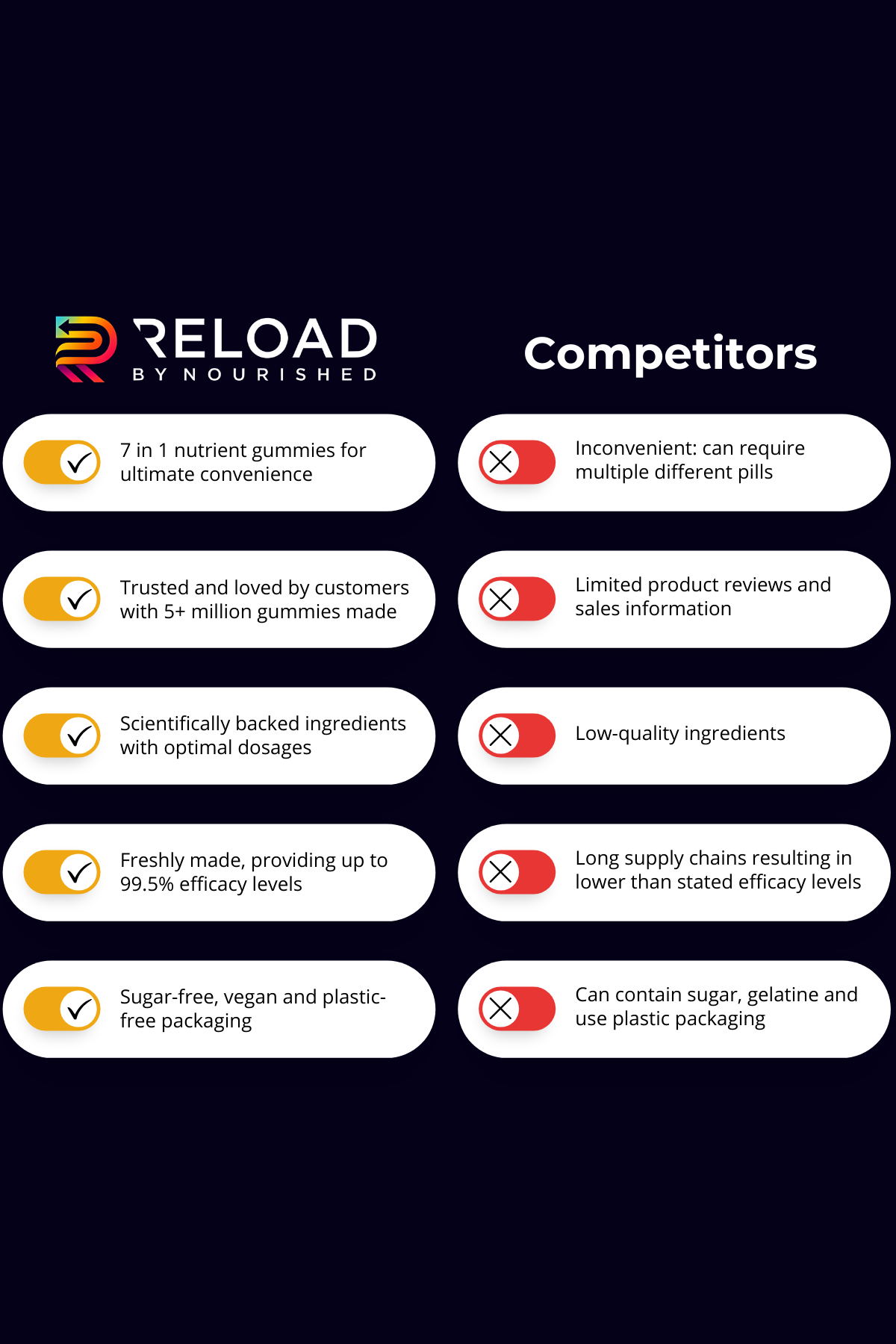 Reload Gummies aren't just any gummies. We've created a formula that guarantees high absorption and the most powerful benefits. When you choose our gummies, you're choosing the most efficient way to get the vitamins your body needs to perform at its peak. Unlike traditional pill supplements, our gummies offer a superior rate of absorption, making sure your body gets the most out of every chew.